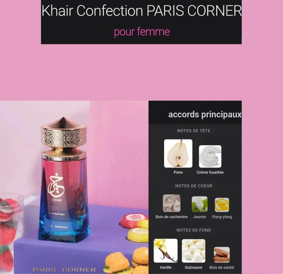 Khair Confection séduit avec l’éclat gourmand de la poire et de la crème fouettée, dévoile un cœur raffiné de jasmin, ylang-ylang et bois de cachemire, puis s’installe sur un sillage irrésistible de vanille, guimauve et bois de santal. Un parfum féminin, floral et gourmand, à la fois tendre, chic et terriblement addictif. Parfait pour celles qui aiment laisser une aura douce, séduisante et inoubliable.