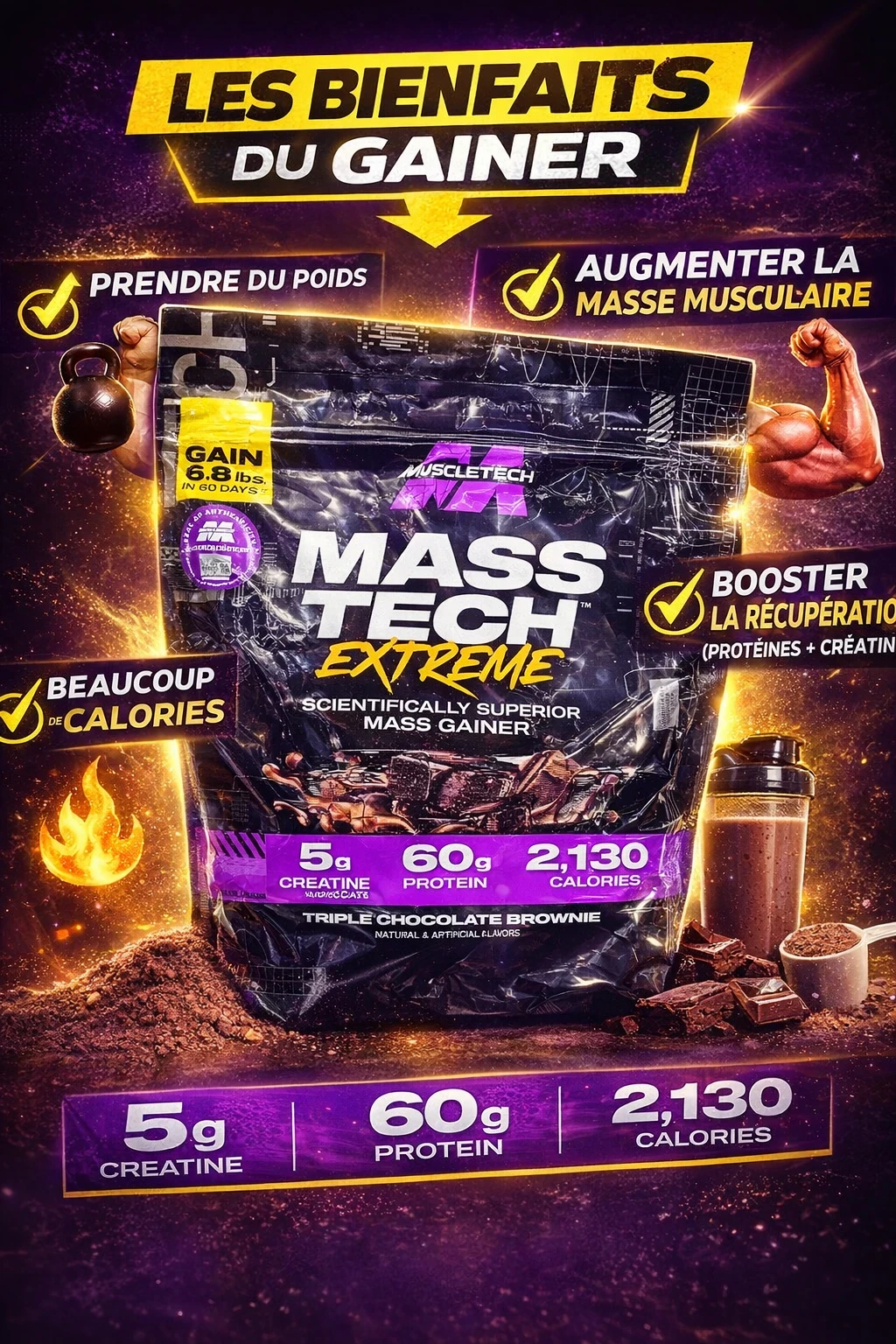 Mass Tech Extreme est un gainer puissant conçu pour les sportifs qui veulent augmenter leur masse musculaire et leur poids rapidement. Sa formule riche en protéines, glucides et créatine aide à améliorer les performances et la récupération après l’entraînement.