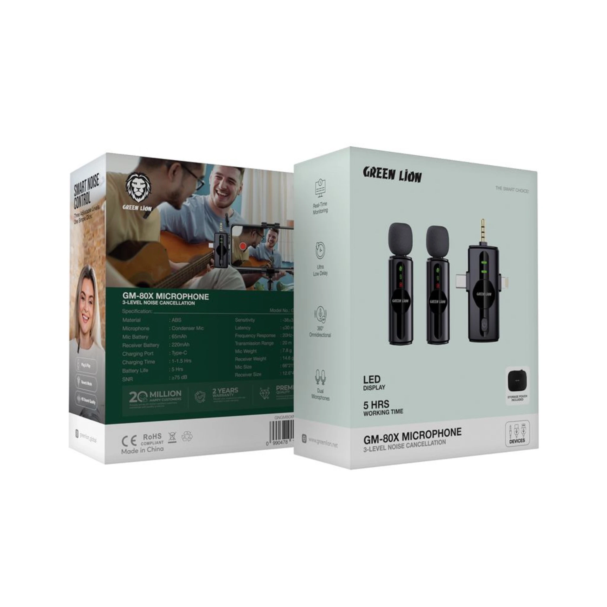 Capturez un son d'une clarté exceptionnelle dans tous les environnements grâce au microphone sans fil Green Lion GM-80X. Doté d'une réduction de bruit avancée à 3 niveaux, il filtre intelligemment les bruits de fond pour des enregistrements de qualité professionnelle. Ce système sans fil polyvalent comprend deux microphones et un récepteur, offrant une flexibilité audio totale pour les interviews, les podcasts, les vlogs, les présentations ou les contenus à deux intervenants. Son autonomie impressionnante de 5 heures permet des sessions d'enregistrement prolongées sans interruption, idéale pour les événements d'une journée, les productions de longue durée ou la création de contenu en continu. L'écran LED affiche en temps réel des informations sur l'état du système, notamment le niveau de la batterie et la qualité de la connexion. La pochette de rangement incluse permet de ranger et de protéger tous les composants, et de les transporter facilement.